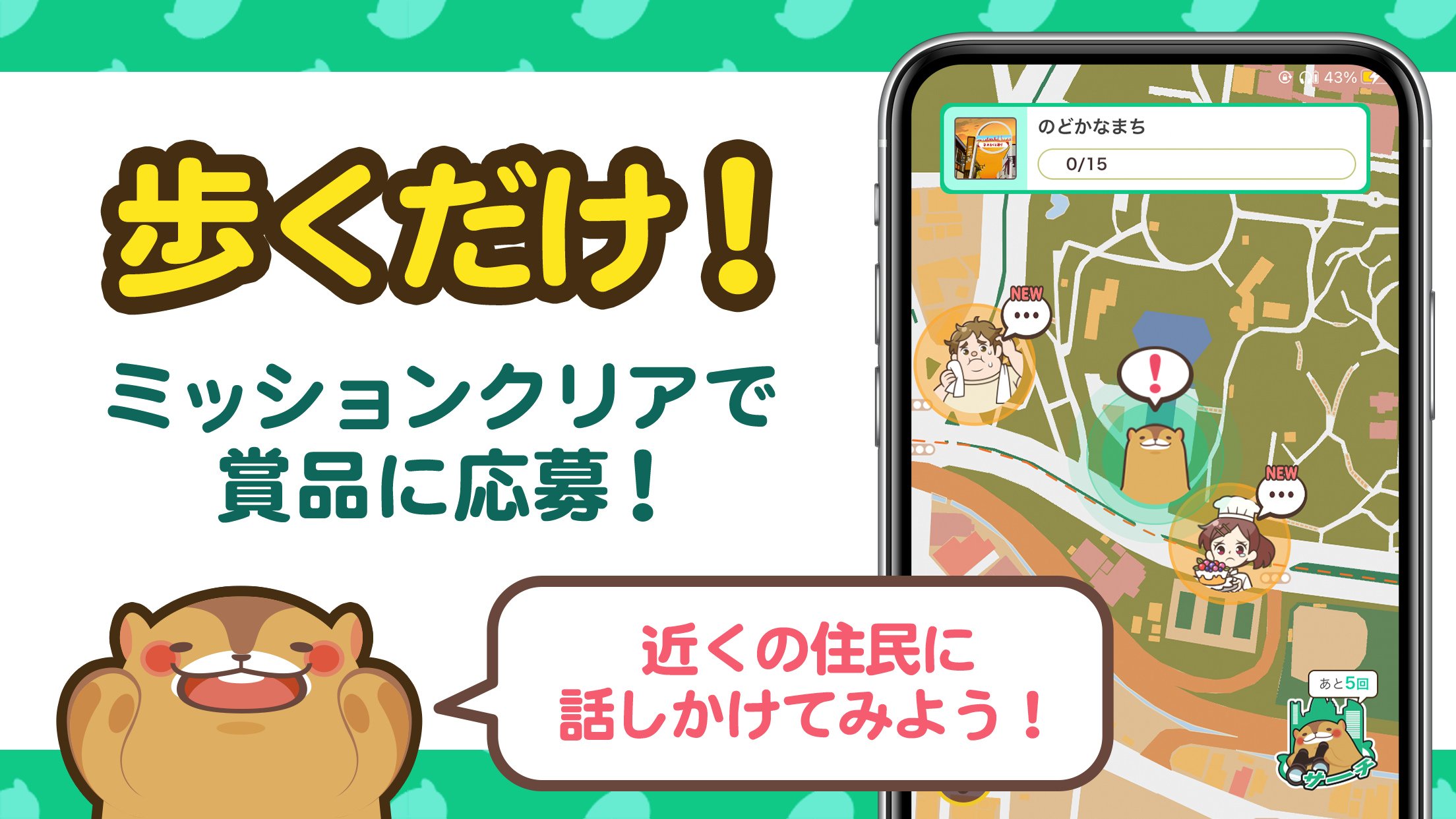 アプリ内で登場する住民キャラクターからの依頼(ミッション)をクリアするとお宝カードやポイントがもらえ、集めたカードで全国の名産品や電子マネー、ギフト券などが当たる抽選に参加できます。ミッションは「〇〇歩歩く」など簡単なものが中心なので、特別な運動をしなくても自然に進められます。
