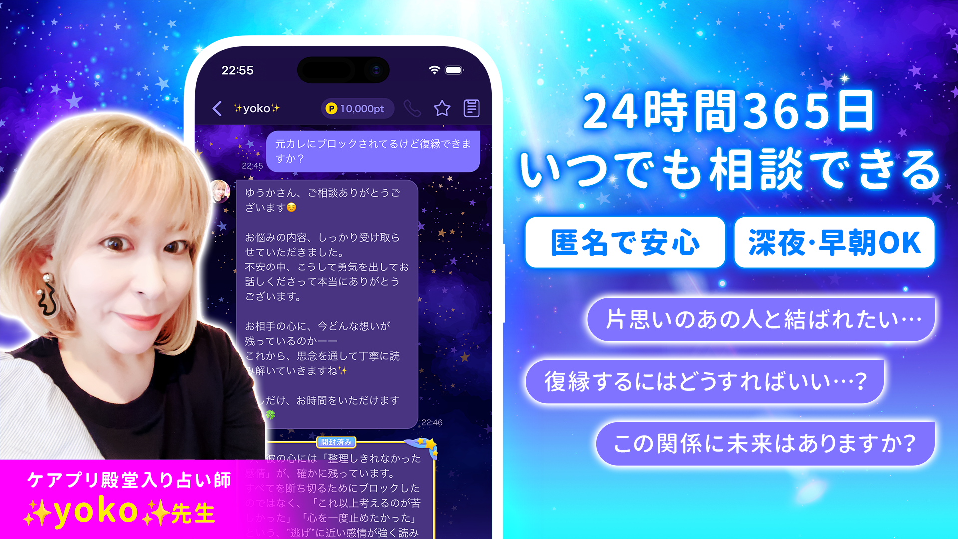 恋に悩む方々が、いつでもどこからでもプロのアドバイザーに相談できるプラットフォームとして、多くの人に利用されています。 実際に使ってみると、ただの占いアプリとは異なる本格的な恋愛相談サービスであることがよくわかります。