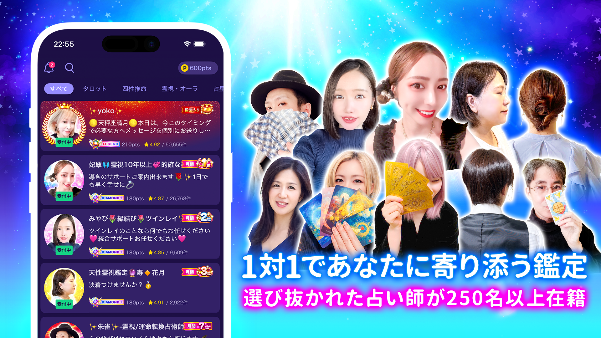 恋愛カウンセラー、復縁アドバイザー、実力派の占い師、人生相談のベテランなど、さまざまな専門家が在籍しており、24時間いつでも対応してくれる点が大きな魅力です。