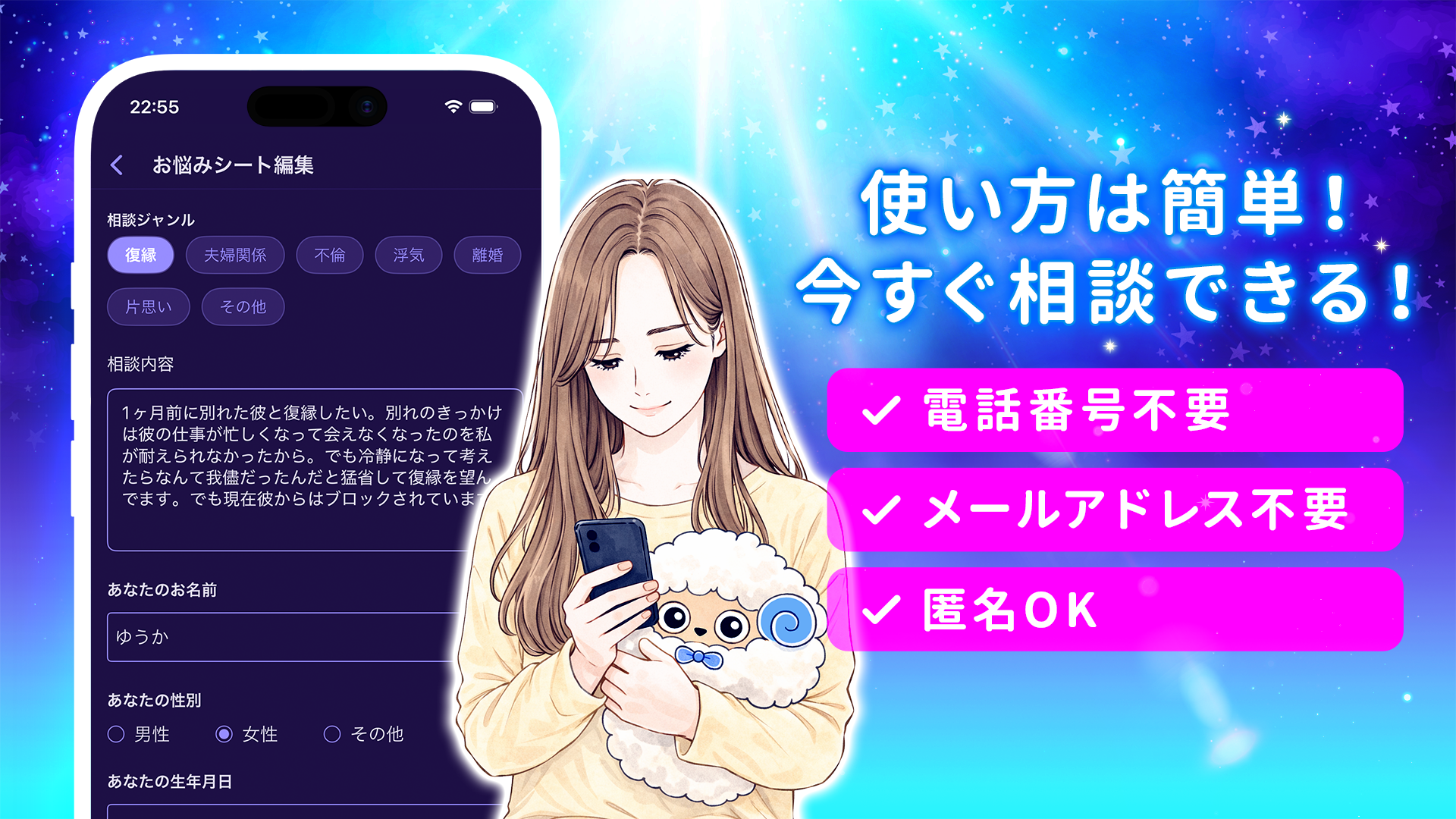 深夜に突然彼からの連絡が途絶えて不安になったときや、復縁の方法がわからなくて心が揺れるときでも、すぐに専門家に本音を打ち明けられる安心感は、言葉では表せないほど心強いものです。