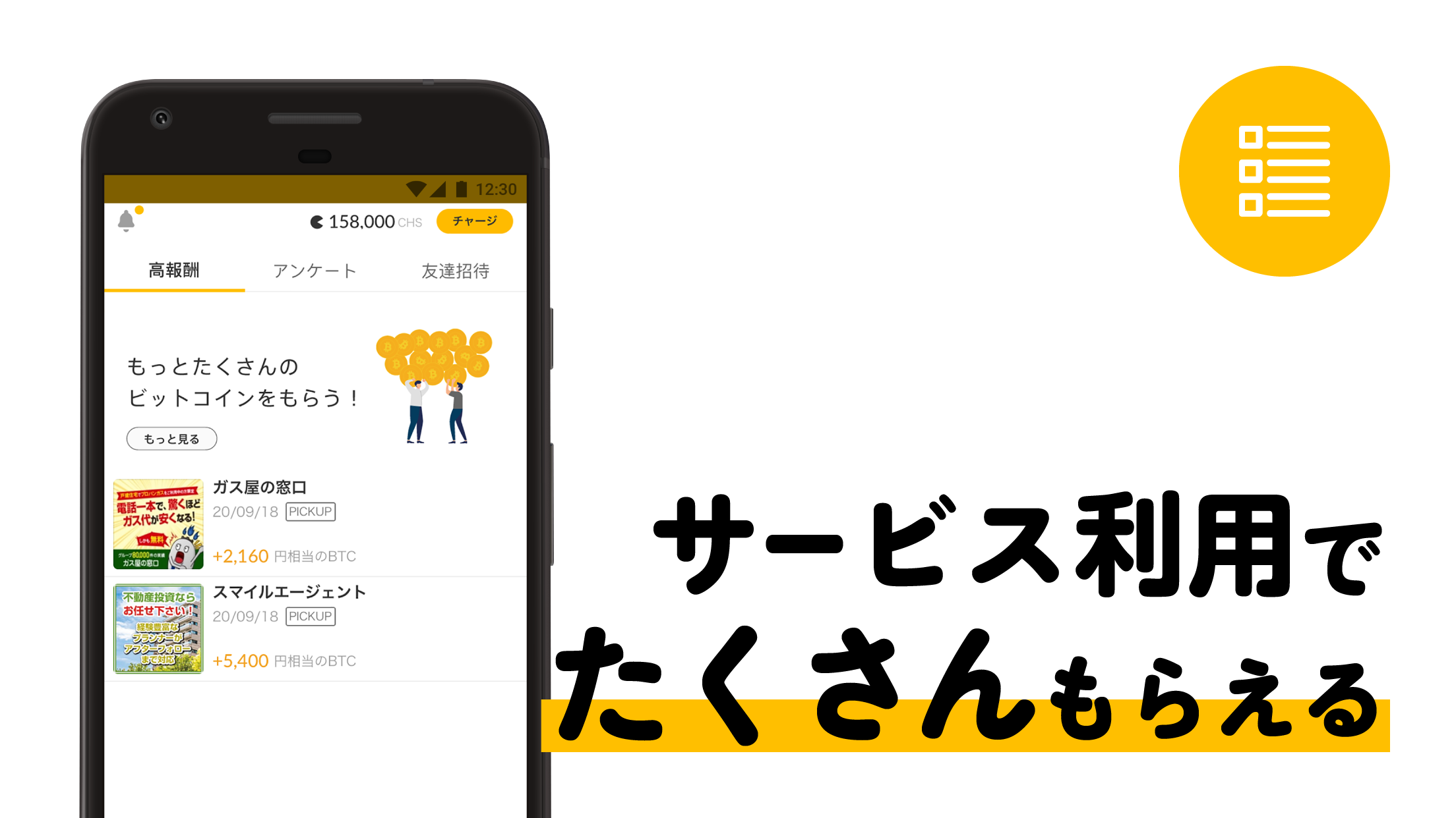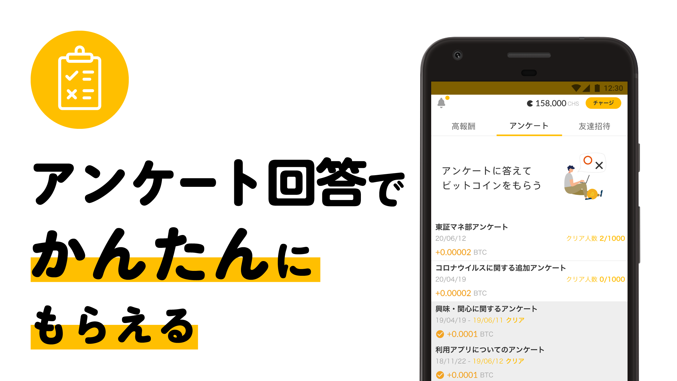 初めてCHSを貯める、10,000CHSを貯める、口コミを1回投稿するといったミッションがあります。ミッションごとにもらえるビットコインの量は異なりますが、中には20円分相当になるものもあり、自分に合ったものを選んでこなせます。