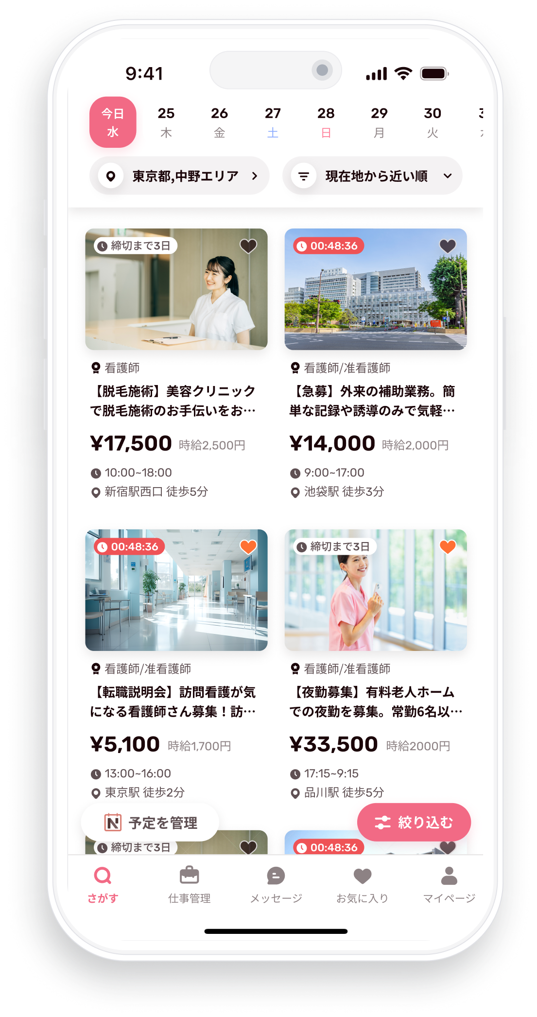看護師の専門スキルを活かした高給与のスポットバイトや、お得なイベント求人が多数用意されています。