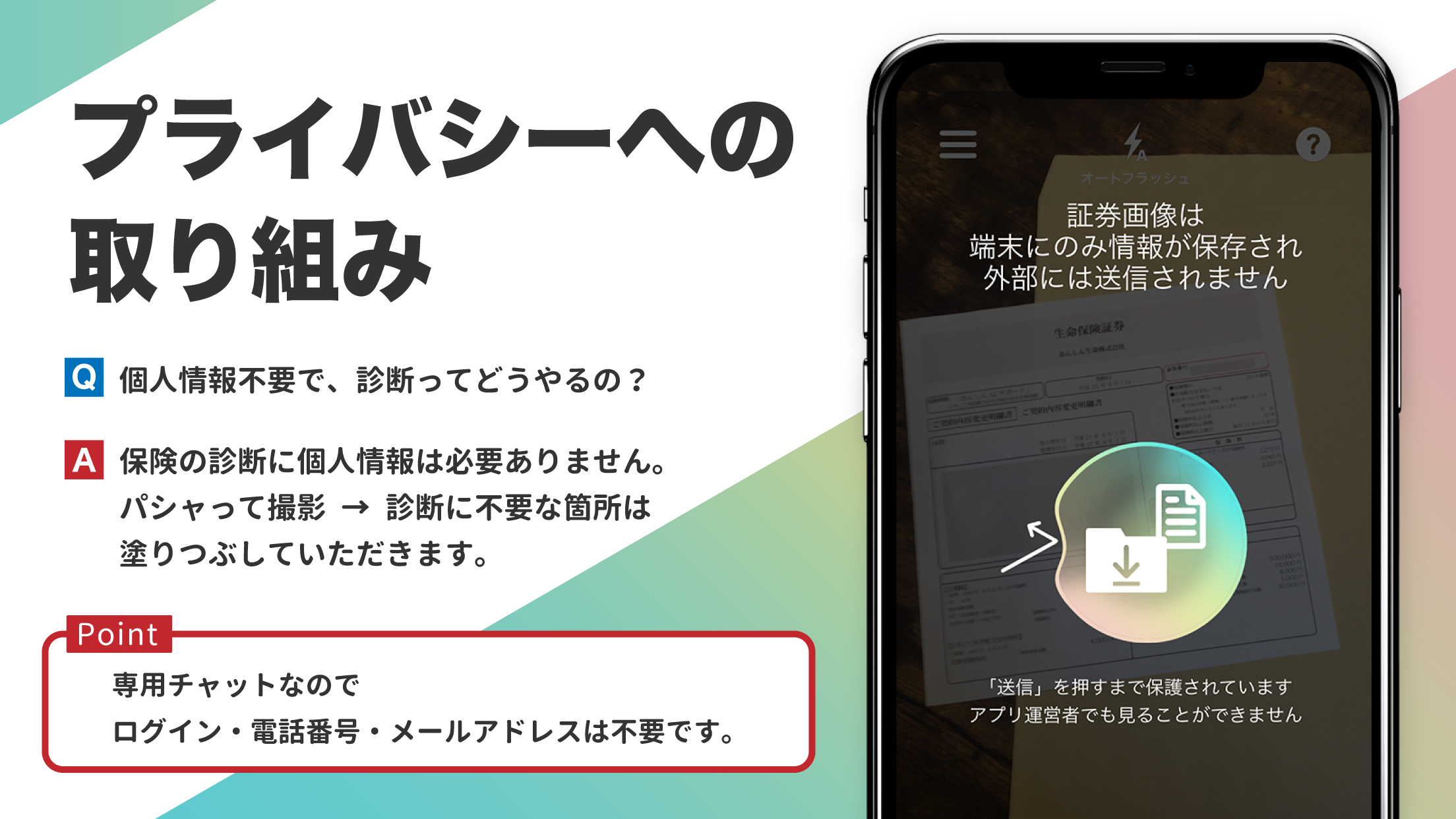 実際にパシャって保険診断を試してみると、操作のわかりやすさにまず驚きました。アプリをダウンロードしたら、すぐに保険証券の撮影画面に進め、個人情報部分を指でなぞって隠すだけで送信準備が完了します。