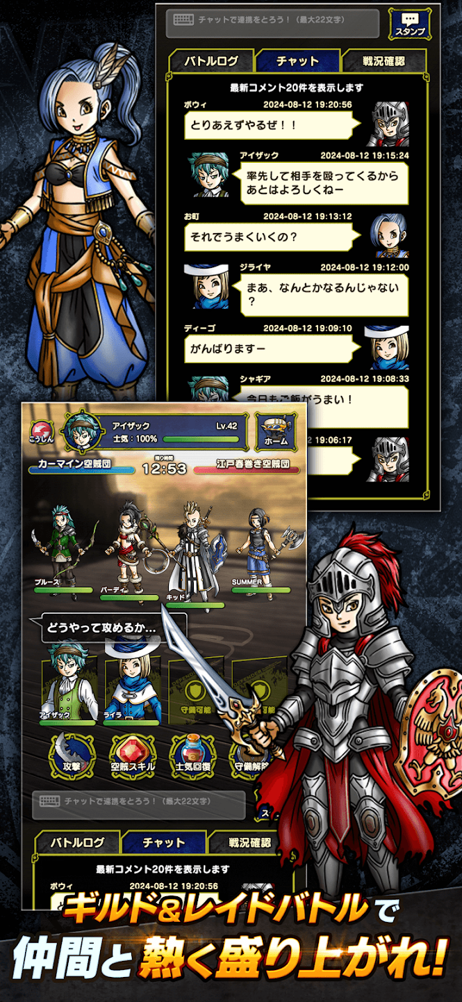 ギルドバトルとレイドバトルの2種類があり、仲間と協力して戦う臨場感が圧巻です。実際に参加してみると、チャット機能を使って「回復お願いします」や「このボスを集中攻撃!」といった連携が自然に生まれ、まるで一緒に冒険しているような一体感があります。