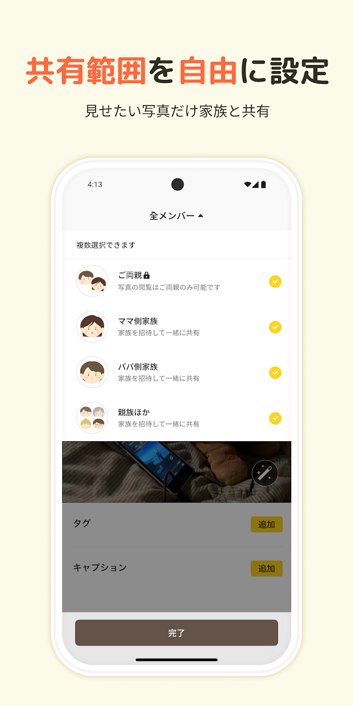 共有された家族はアプリを開くだけで最新の写真を見ることができるので、日々のやり取りの手間がかなり減ります。